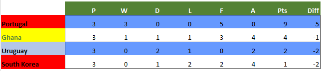 South Korea had to beat Portugal and hope that they did so by a greater margin than Uruguay could beat Ghana. A draw or a win for Ghana would see them through no matter what happened to Portugal.